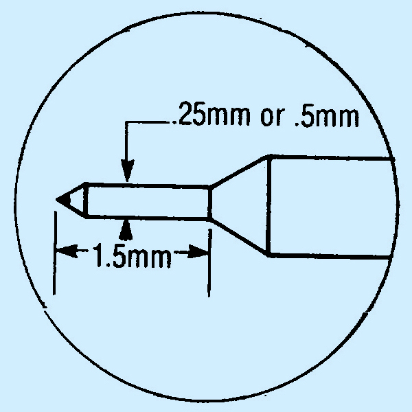 這些金剛石劃筆的針座直徑為 0.8 毫米,針桿直徑為 0.5 毫米或 0.25 毫米,用于固定金剛石針尖。 60 度錐角,針尖半徑為 0.12 毫米。集成的 6.35 毫米陽極氧化鋁制六角形(非滾花)手柄帶有防滑的指槽,便于控制且不易滑動。每個金剛石劃針都裝在一個保護塑料管中。
