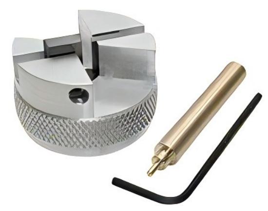 二、用于鍍碳儀的手動雙臺階碳棒磨尖工具。將石墨棒插入工具中,手動旋轉(zhuǎn),通過兩個預(yù)設(shè)的碳化鎢刀具進行切削,以形成正確的臺階。隨附黃銅調(diào)節(jié)工具。