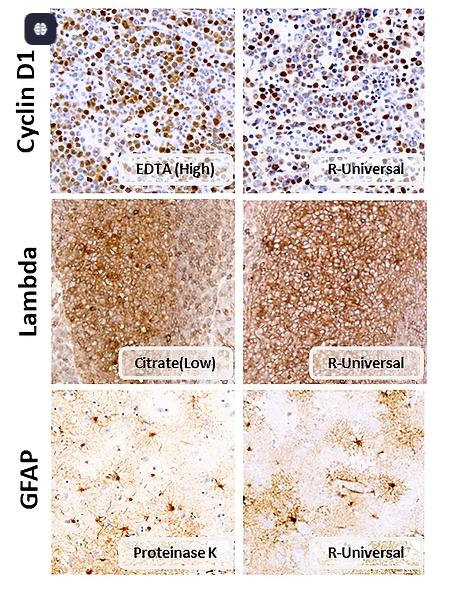 在英國的病理科室進(jìn)行的大量測試證實,無論是通常需要低pH、高pH緩沖液修復(fù)的抗原,還是傳統(tǒng)上需要蛋白酶處理的抗原(如Ep-CAM、GFAP等),甚至是過去在福爾馬林切片上難以染色或未經(jīng)測試的抗體,使用R-Universal緩沖液配合適當(dāng)?shù)男迯?fù)設(shè)備,均能獲得優(yōu)異的染色效果。與使用各自特定緩沖液的傳統(tǒng)方法相比,R-Universal能提供更強的染色信號、更高的陽性/陰性細(xì)胞對比度,并能顯著降低因修復(fù)不充分導(dǎo)致的假陰性風(fēng)險(在部分案例中,假陰性率降低達(dá)30%以上)。